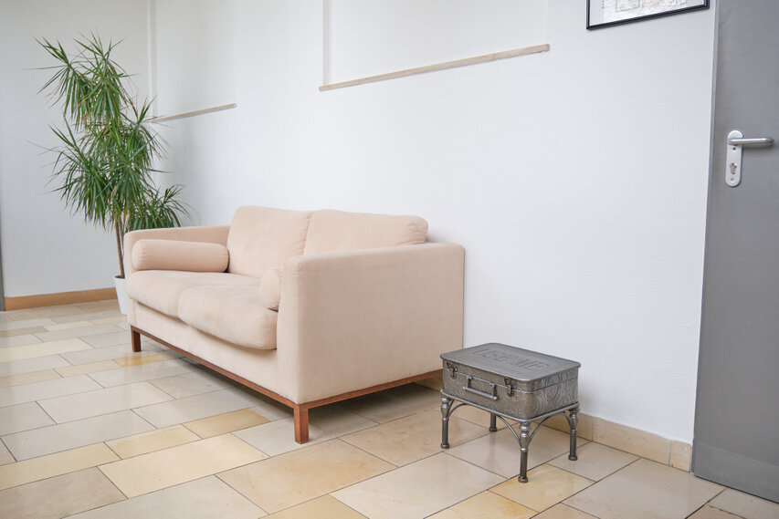 Zwar gibt es zu dem Gebäude zwei verschiedene Eingänge, nutzen Sie jedoch bitte den im Innenhof des Geländes. Dort befindet sich ein Zugang wie eben in einer alten Schule, mit vielen Glastüren. Halten Sie sich dort weiter rechts und Sie werden zur Praxis geleitet. Nehmen Sie auf dem bequemen Sofa Platz, denn dort hole ich Sie ab.